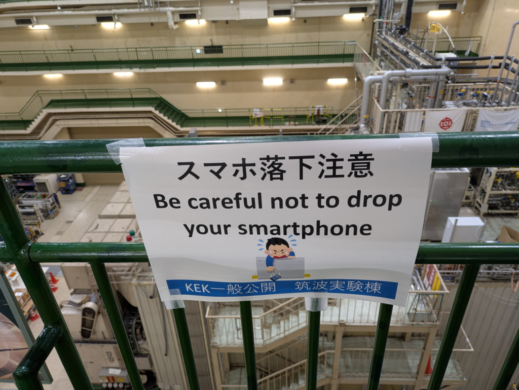 見学は4階部分の通路のみ。この写真は「スマホ落下注意」の注意書き。