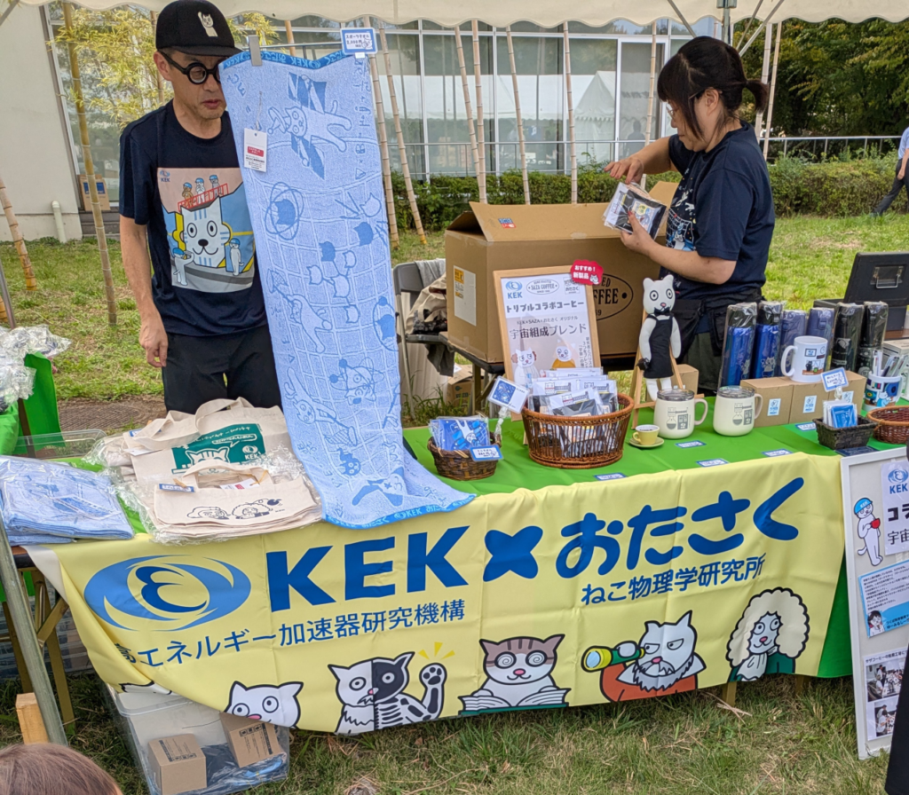 この写真が売店の様子。KEKとおたさく(ねこ物理学研究所)のコラボグッズが並んでいて、テンションが上がる。