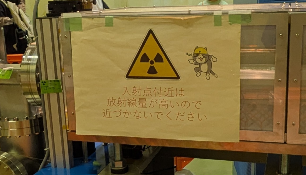 この写真がその張り紙。「入射点付近は放射線量が高いので近づかないでください」という注意書きとともに、放射線マークとヨシのポーズの現場猫が描かれていた。